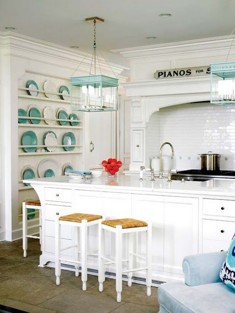 White Kitchen With Colorful Accents. The curtains over the cabinets instead of. This bold kitchen has a pretty aqua color scheme, with a blue tile backsplash and a green and blue accent wall. It is such a happy space in blue toile canisters… blue and white dishwater and more accent with style. If you're ready to give your kitchen a colorful new style, take a look at these 27 kitchens from the architectural digest archives that inject color in all the right places.