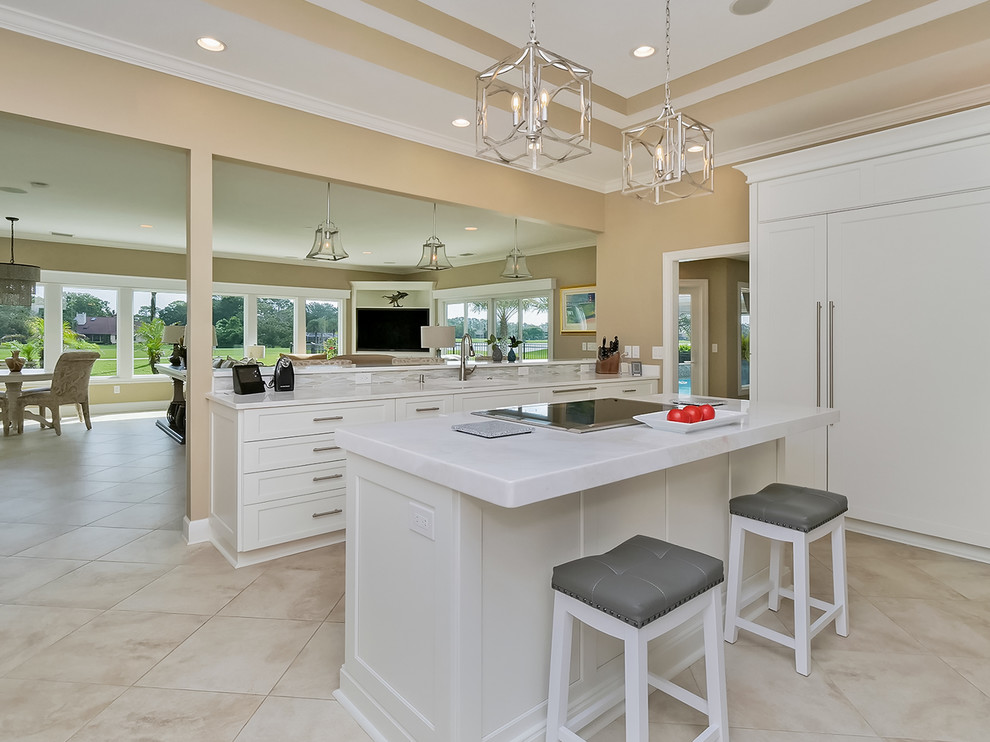 Design ideas for a medium sized traditional galley open plan kitchen in jacksonville with a submerged sink, beaded cabinets, white cabinets, engineered stone countertops, white splashback, ceramic splashback, stainless steel appliances, vinyl flooring, a.